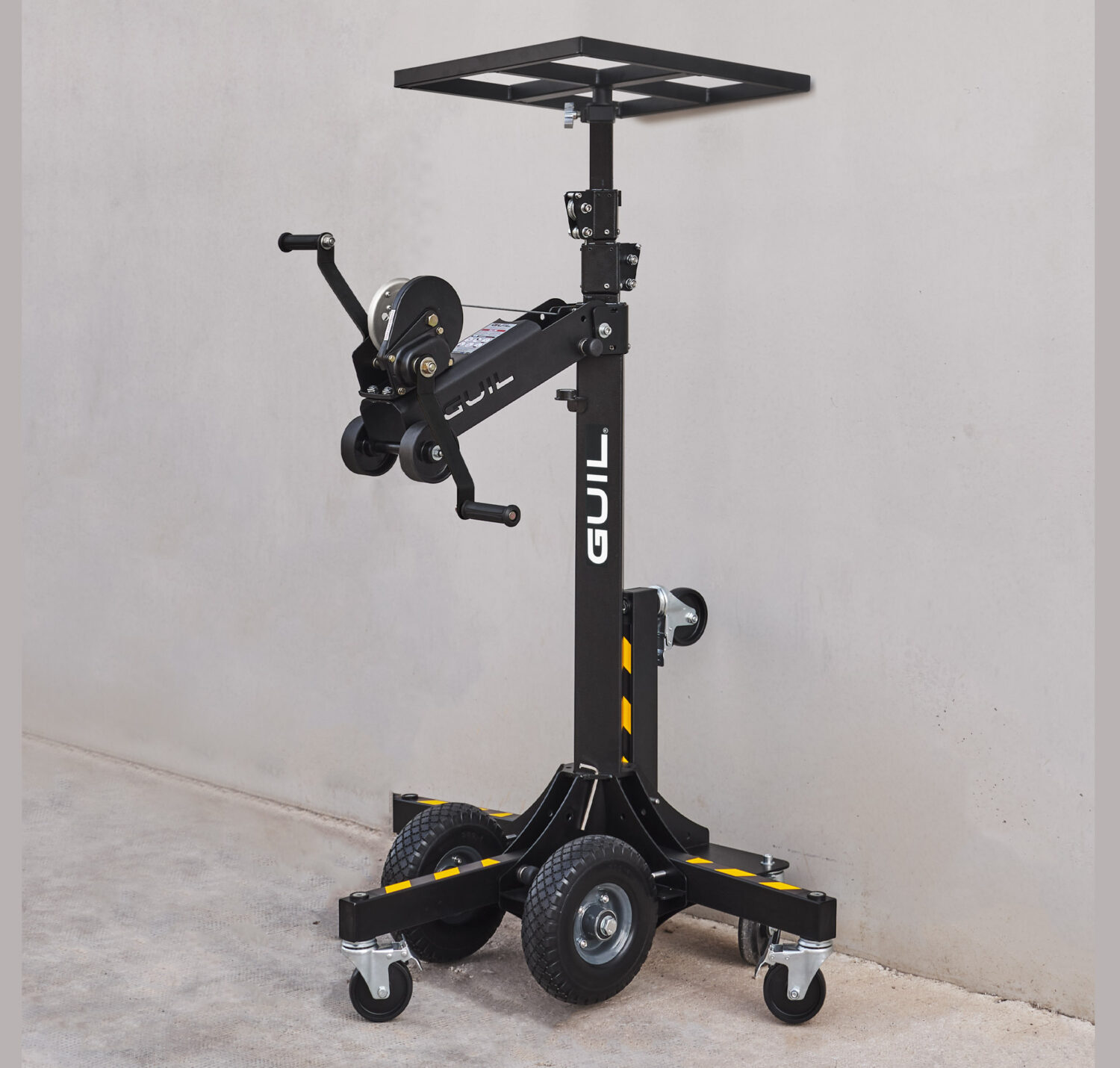 Der kompakte Sockel ist mit 4 ausklappbaren Beinen mit Rädern und Nivellierfüßen ausgestattet, wodurch der Lift auf unterschiedlichsten Untergründen stabil steht. Zusätzlich verfügen 4 weitere Rollen, davon zwei pannensicher, für einen mühelosen Transport auch auf unebenem Gelände. So bleibt der Materialheber flexibel und mobil – ideal für den Einsatz auf Baustellen oder in Werkstätten.