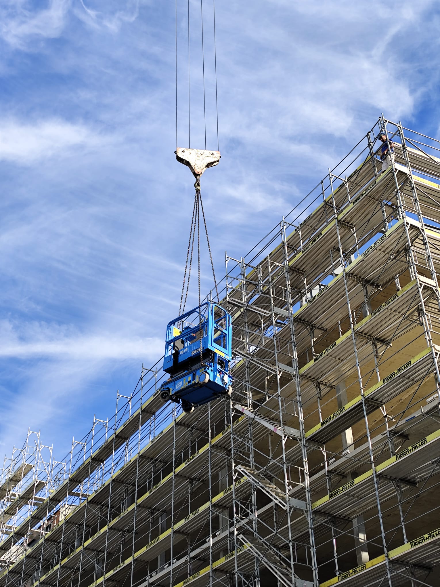 Hoch hinaus! Eine Arbeitsbühne schwebt an einem Kran über einer grossen Baustelle – ein Bild, das die Kraft und Vielseitigkeit unserer Maschinen auf beeindruckende Weise einfängt. Die Gerüstlandschaft und der blaue Himmel sorgen für eine schöne Kulisse. - 🥉 Platz 3: