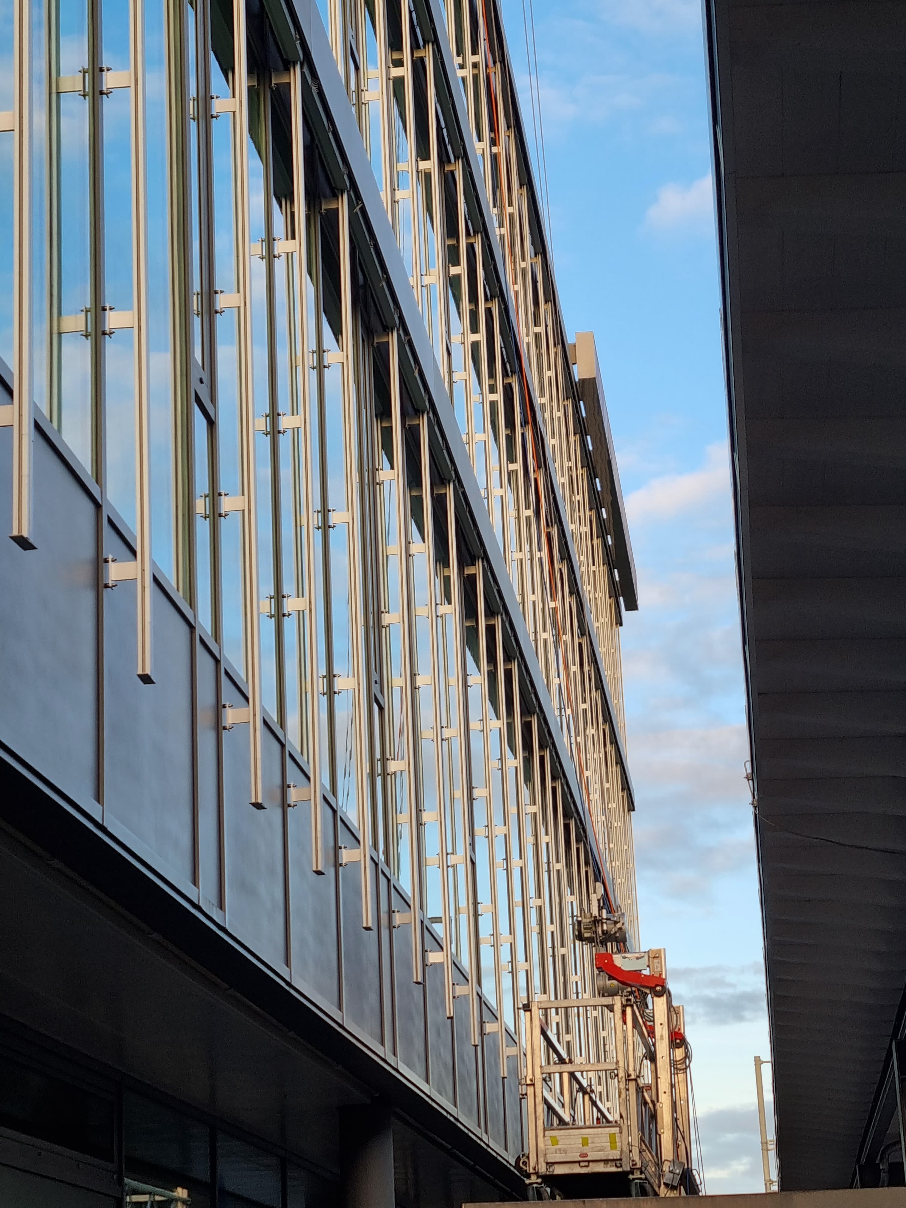 Ein Spiel aus Licht, Spiegelungen und Höhe: Ein Fassadenlift im Einsatz an einer schwer zugänglichen Glasfassade. Die Perspektive und das sanfte Licht der untergehenden Sonne machen dieses Foto zu einem echten Hingucker.