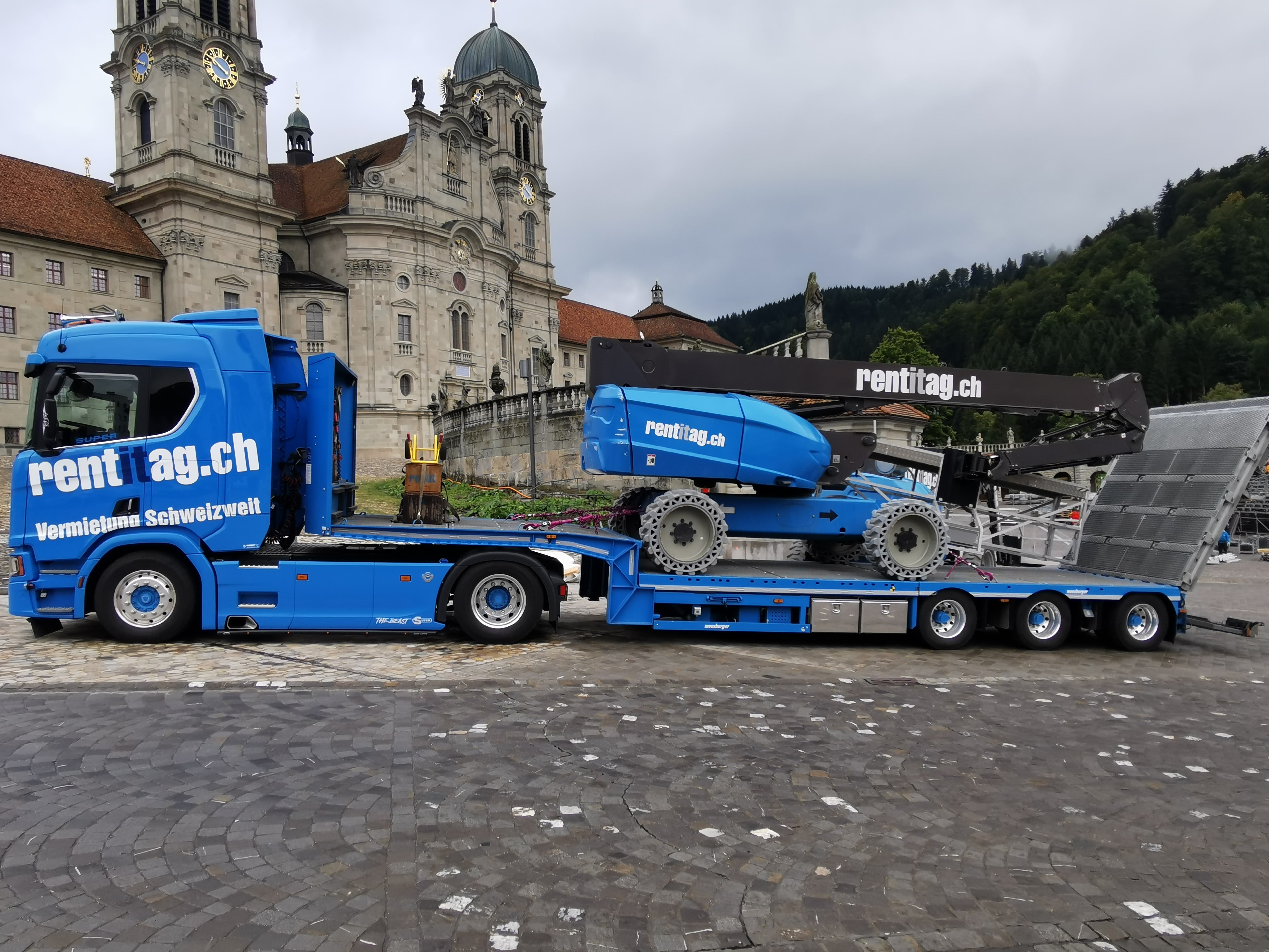 Ein Rentit-LKW mit einer Hebebühne, perfekt in Szene gesetzt vor der majestätischen Kulisse des Klosters Einsiedeln. Moderne Technik trifft auf historische Architektur – einfach ein beeindruckender Anblick! - 🥈 Platz 2: